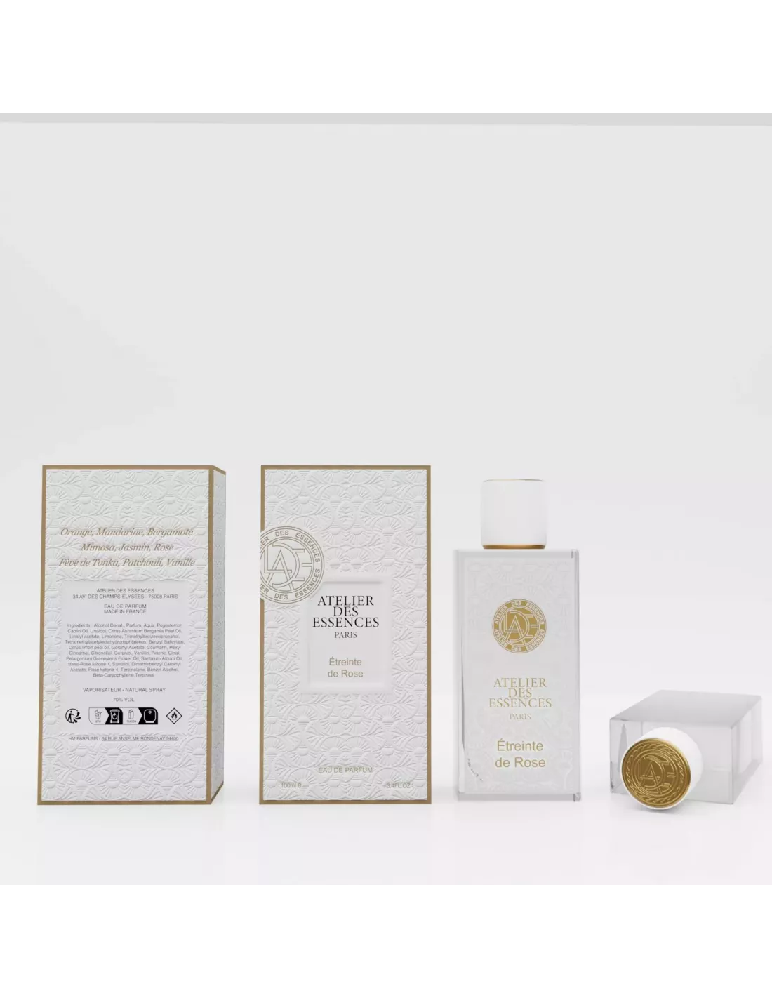 Étreinte de Rose est présenté dans un flacon de 100 ml au design raffiné et intemporel. Le flacon, orné de détails dorés, reflète la beauté et la sophistication de la fragrance qu’il renferme, faisant de ce parfum un véritable objet de désir.